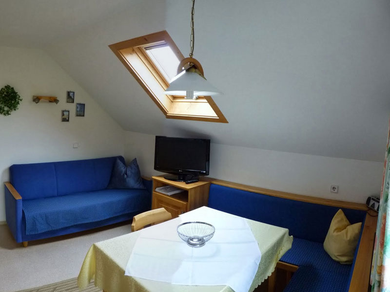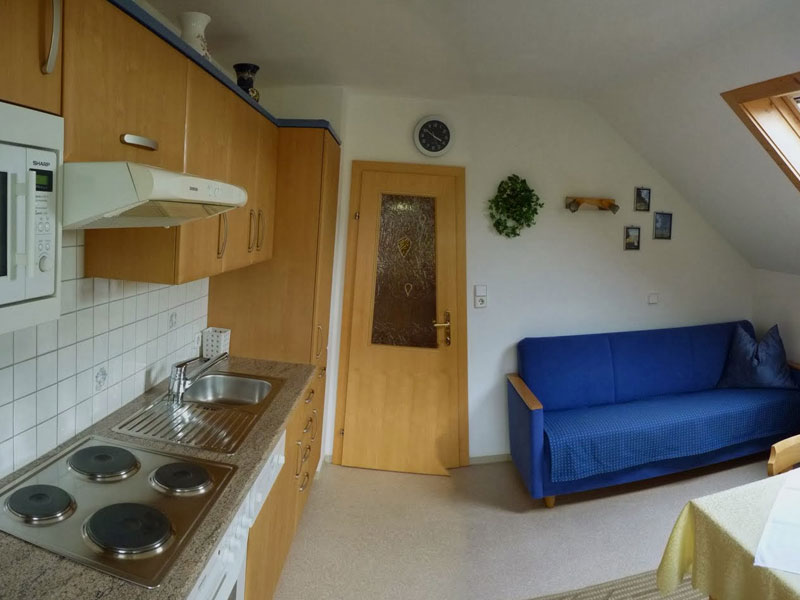 68m2 flat, with 2 bedrooms (one with TV), bathroom with shower WC, 1 Extra-WC, large, fully equipped kitchen with dining table including dishes, towels, bed linen, and bathroom towels, one additional couch in the kitchen, Sat-TV, Radio, southern balcony.